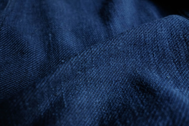 生地は、太番手の糸で編み込まれたインディゴコットンリネン素材。